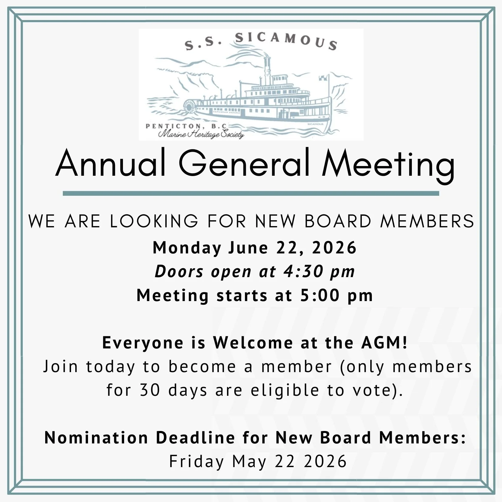 We’re pleased to let you know that the S.S. Sicamous Marine Heritage Society will be holding its Annual General Meeting (AGM) on: