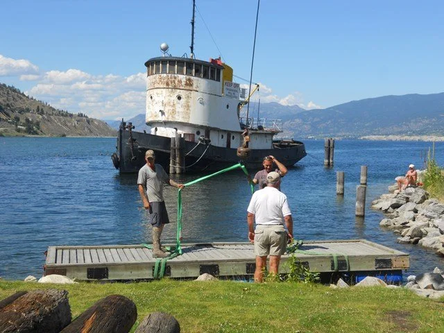 Volunteers start construction of a floating dock, to allow easy access to the Tug