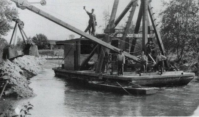 Image: Dredge boat “Heron” and her crew – working to dredging soil from the bed of the Okanagan River. Photo courtesy of the Penticton Museum and Archives.