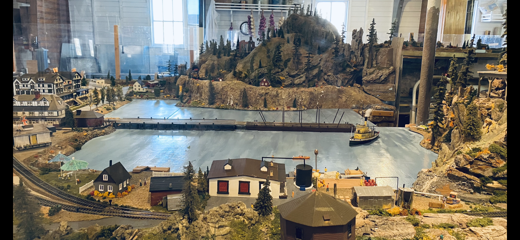 The 46’ x 14’ layout is constructed in HO scale, on board the cargo deck of the S.S. Sicamous, now landlocked on the shores of Okanagan Lake. Most of the buildings were built by scratch by members. The trestles, bridges and two boats and all the trees were handmade. There is approximately 500 feet of track, and members have invested well over 10,000 hours in the construction.